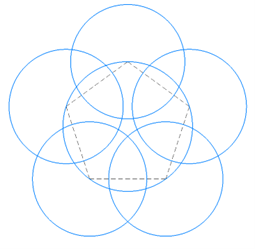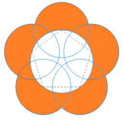 Вершины правильного пятиугольника являются центрами пяти окружностей диаметра 9 дм. Вокруг пятиугольника описана окружности. Длина стороны правильного пятиугольника равна 60 см. После того, как робот закончил чертить, полученный рисунок раскрасили (см. Закрашенная область).