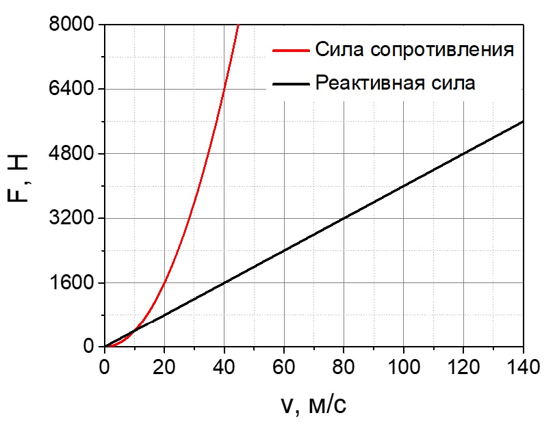 На лодку массой m = 120 кг, движущуюся по озеру по круговой траектории радиуса R = 62 м, действует сила сопротивления, зависящая от модуля скорости по квадратичному закону, графически представленному на рисунке. Для движения по воде работает водомётный двигатель. Модуль реактивной силы, создаваемой двигателем, зависит от модуля скорости лодки, как показано на том же рисунке.
