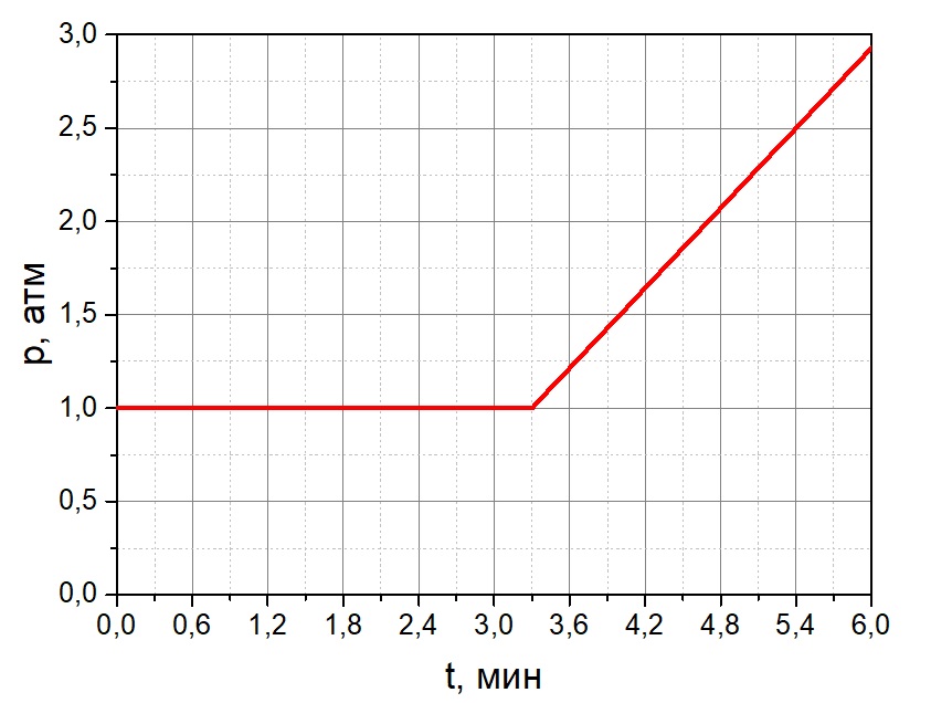 В герметичный сосуд объёмом V = 1 л налили v = 3,3 мл воды и начали закачивать некоторый газ со скоростью u = 0,5 г/мин при температуре t = 22оС. Начальное давление воздуха в сосуде p = 1 атм. График зависимости давления в сосуде от времени изображён на рисунке. Объём жидкости считайте постоянным.