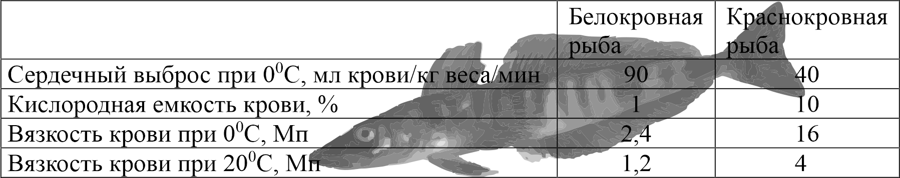 При низких температурах вязкость жидкостей, особенно таких как кровь, значительно возрастает, что существенно замедляет скорость доставки и ухудшает доставку кислорода к тканям. С другой стороны, при низких температурах возрастает растворимость кислорода в жидкостях (это верно и для плазмы); так в морской воде, в поверхностных слоях океана, при температуре 0°С растворимость кислорода будет около 8 мл/л, а при +15°С – 5,6 мл/л. Таким образом, с одной стороны отсутствие гемоглобина и уменьшение вязкости крови приводит к возрастанию скорости прохождения жидкости через организм, а с другой значительно снижает кислородную емкость крови (около 10% от емкости крови краснокровных), даже с учетом повышенной растворимости кислорода и увеличенного объема крови. Было показано, что у ледяных рыб существуют адаптации разного уровня, компенсирующие особенности жизнедеятельности при отсутствии дыхательных пигментов. К ним относятся: низкий уровень метаболизма, хорошо кровоснабжаемые жабры, увеличенный объем крови, повышенный сердечный выброс (более чем в два раза, по сравнению с другими представителями подотряда нототениоидных, до 8% от общего объема), активное поглощение кислорода кожей, усиленный кровоток с низкой вязкостью, расширенные капилляры, крупное сердце (с очень большим количеством митохондрий, да, и в целом, содержание митохондрий у них повышено), усиленная васкуляризация кожи (благодаря чему появляется возможность поглощать кислород не только жабрами, но и всей поверхностью кожи). Кроме того, и это важно для проживания при околонулевых температурах, ледяные рыбы обладают специальными механизмами, препятствующими образованию льда. При этом, несмотря на значительные изменения морфологии их мозг и сенсорные системы мало чем отличаются от аналогичных органов других рыб с красной кровью.